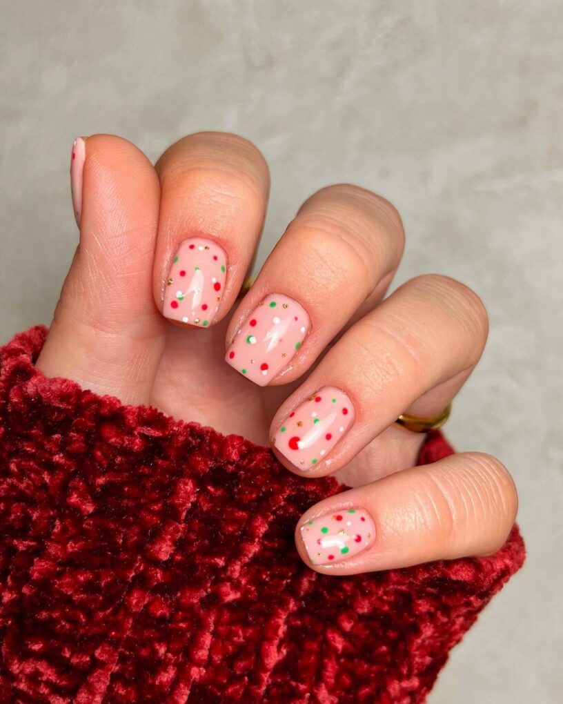 Add a touch of vintage charm to your New Year’s Eve ensemble with the playful charm of Holiday Polka Dot Nail Art, where vibrant polka dots dance across your nails to create a whimsical celebration of color and joy, providing a bright and stylish introduction to the coming year.