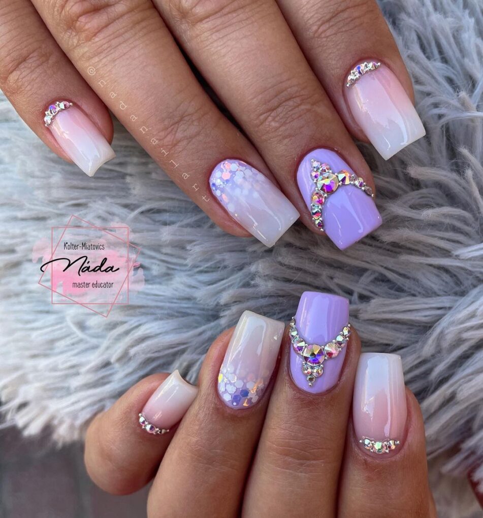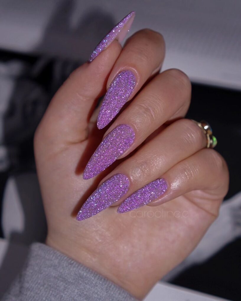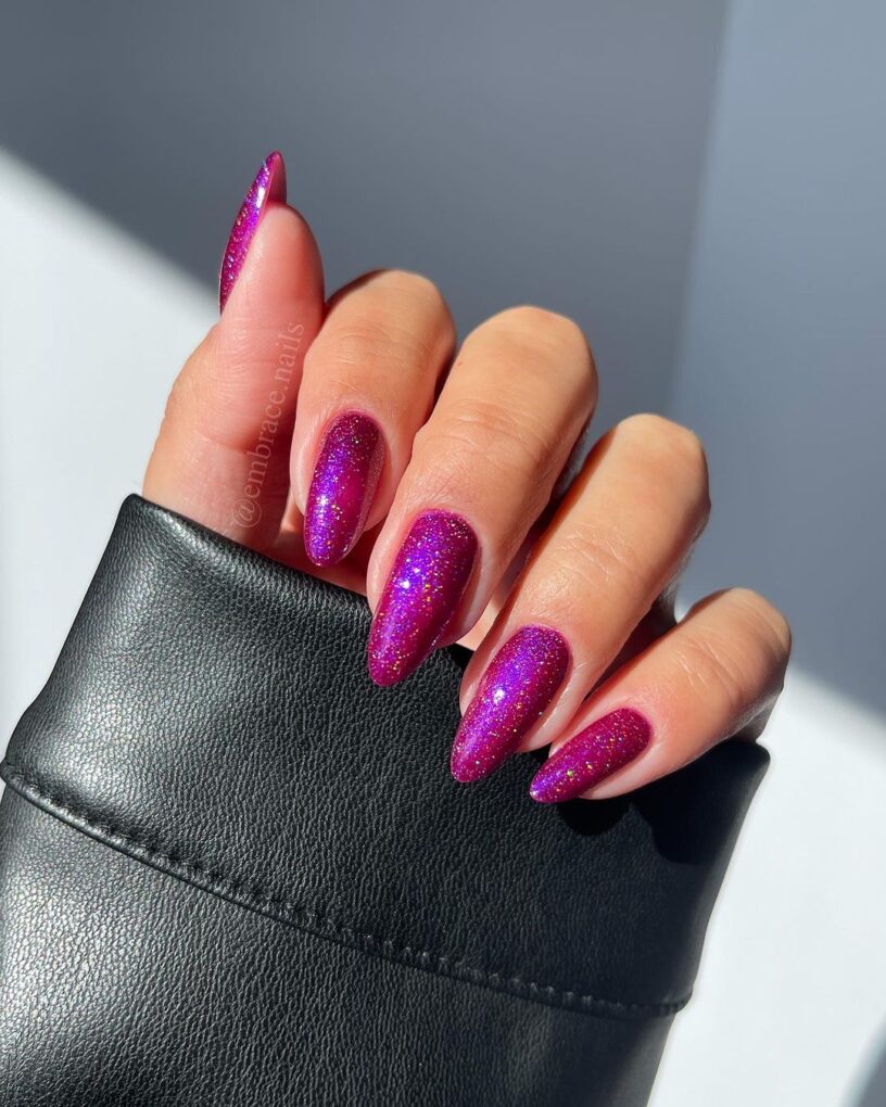 Decorate your nails with sparkling purple hues that will add a touch of dazzle and playfulness, making your fingertips shine and sparkle like precious stones.