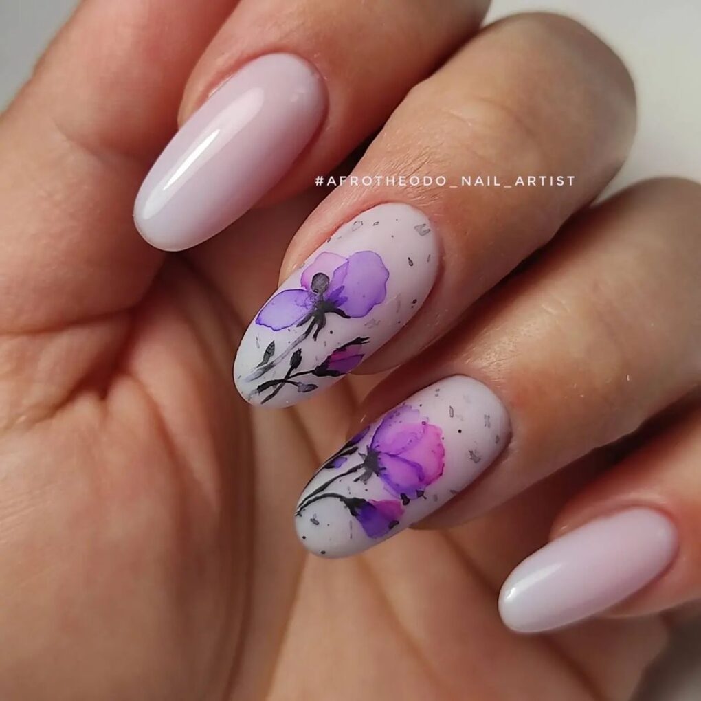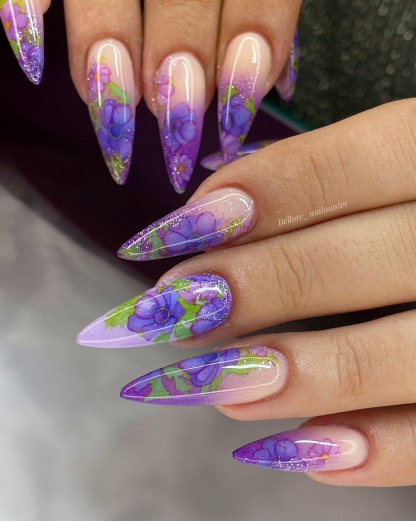 Infuse your nails with the elegance of nature as purple floral designs bloom gracefully, creating a bold and beautiful look that combines the sophistication and timeless charm of blooming flowers.