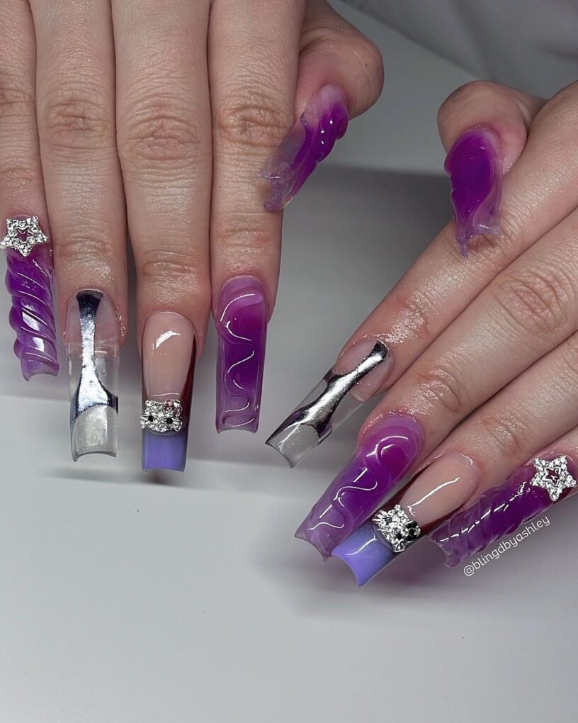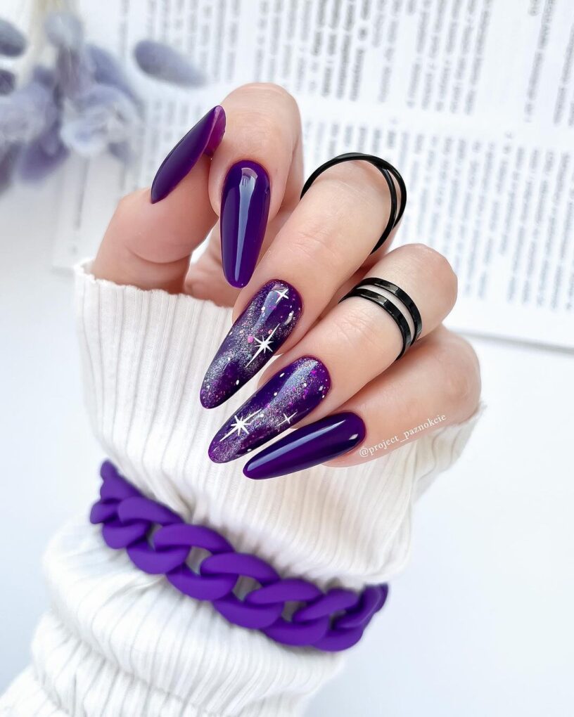 Enjoy celestial elegance with purple star nails: a constellation of stars adorns your nails in an enchanting composition, creating a bold and beautiful statement that brings the enchanting beauty of the night sky to your fingertips.