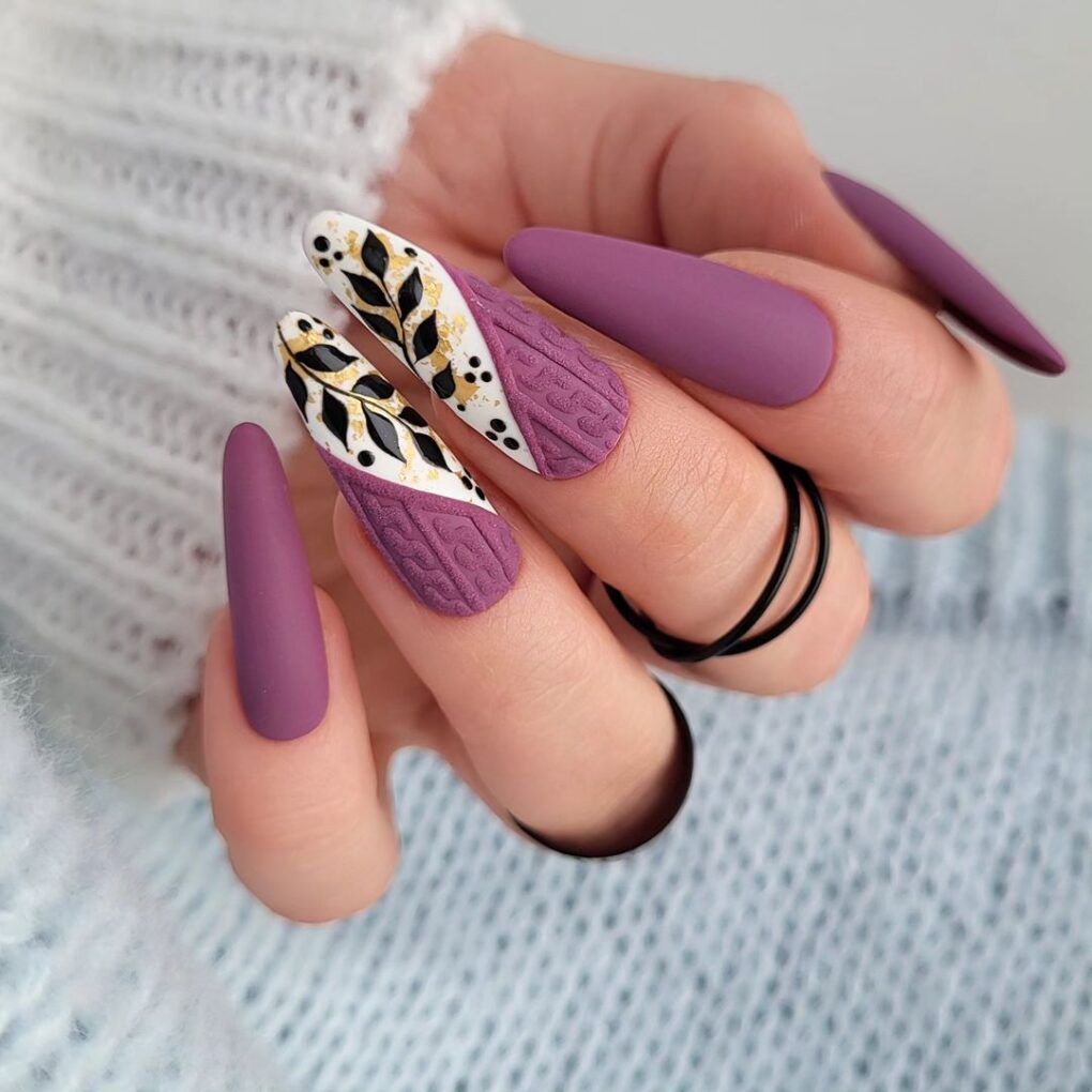 Immerse your nails in the warmth of “Cozy Sweater,” where soft lavender tones intertwine with intricate knitting-inspired patterns to create a uniquely comfortable and bold look that brings the cozy charm of winter fashion to your manicure.