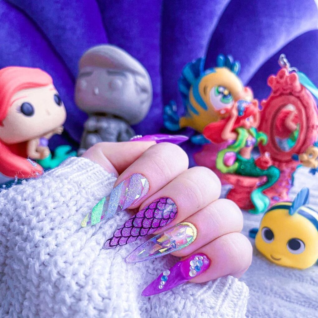 Immerse yourself in enchantment with Mermaid-Inspired Nails, where shimmering purple hues and ethereal flakes intertwine to create a mesmerizing and bold statement that brings the mystical allure of the sea to your fingertips.