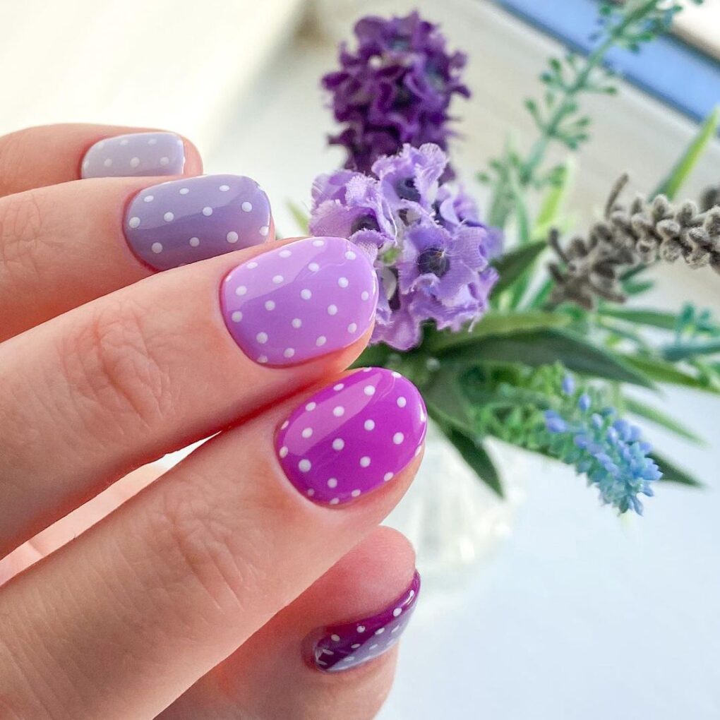Add playful sophistication to your nails with “Purple Ombré Polka Dots,” where a gradient of purple hues seamlessly blend with whimsical polka dots for a lively and bold look that combines chic elegance with a touch of fun.