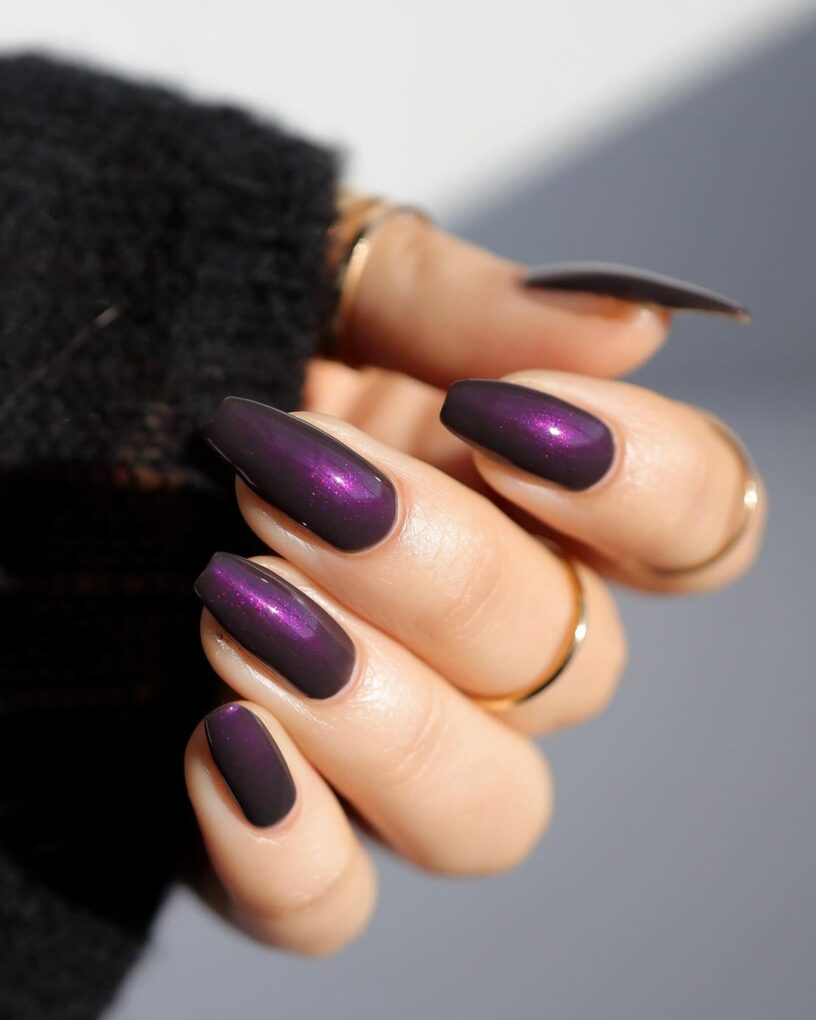 Embrace the glamor of midnight mysticism with deep and enchanting midnight purple nails that effortlessly exude sophistication and make a bold statement, perfect for a glamorous evening.