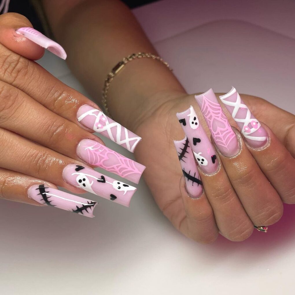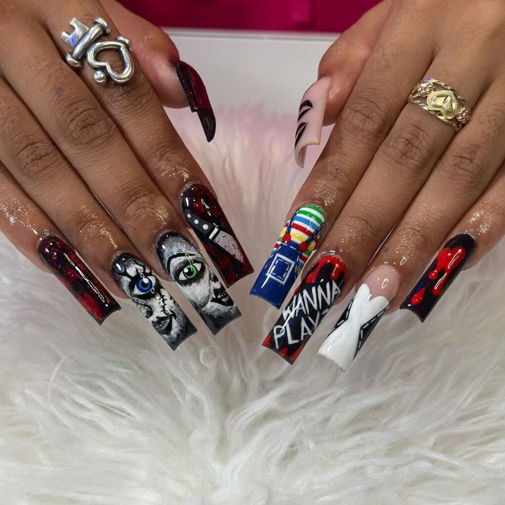 Unleash your inner villain with a playful twist: This spooky nail design combines the essence of Halloween with feminine charm, allowing you to slay the day with intriguing and enchanting style.