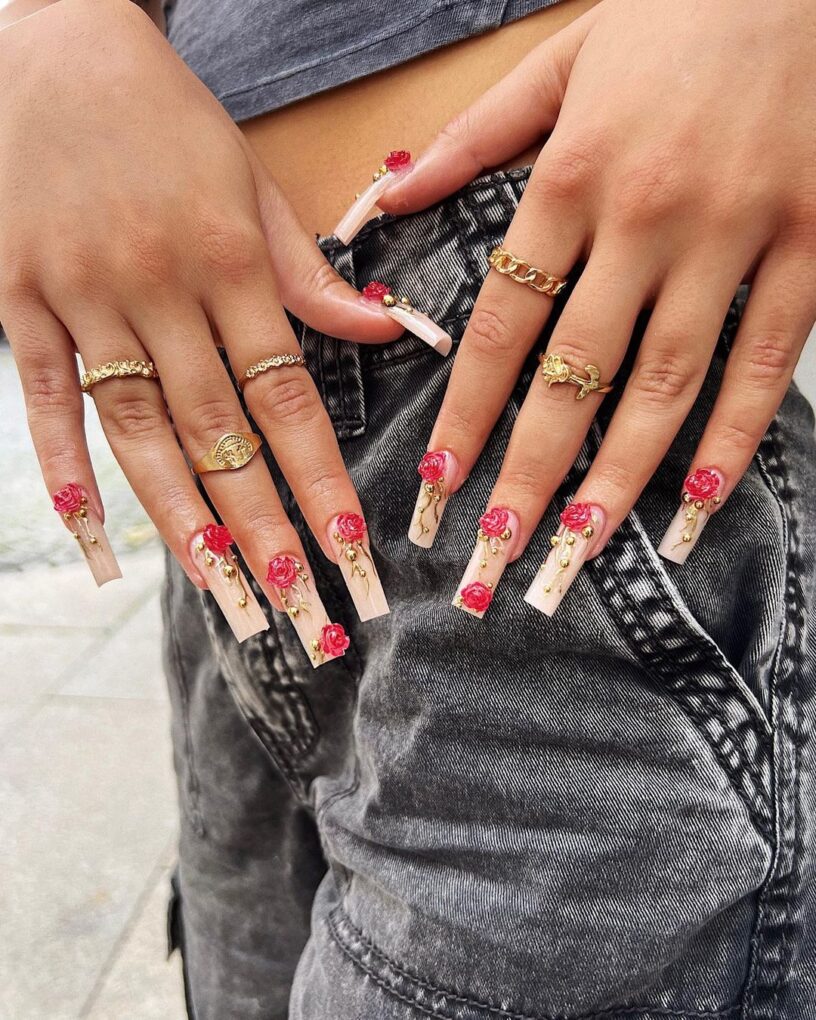 Embrace your villainous style with these enchanting nails that fuse delicate pink flowers and luxurious gold accents to speak of elegance and ensure you’ll spend the day in royal style.