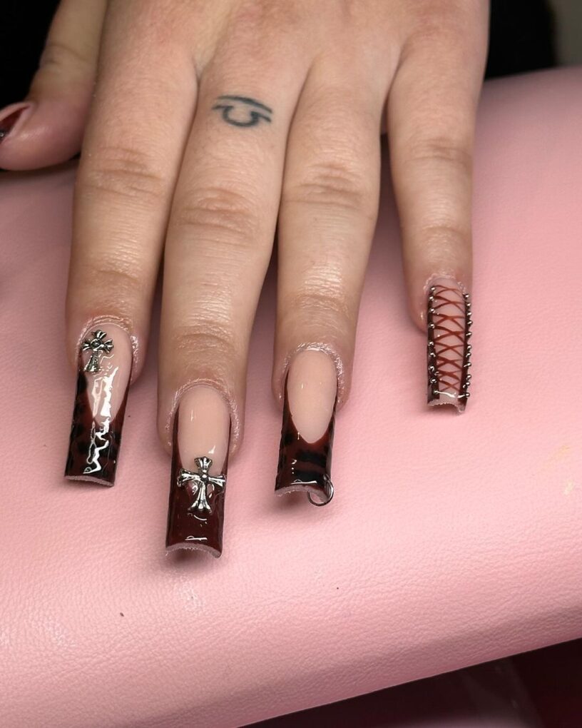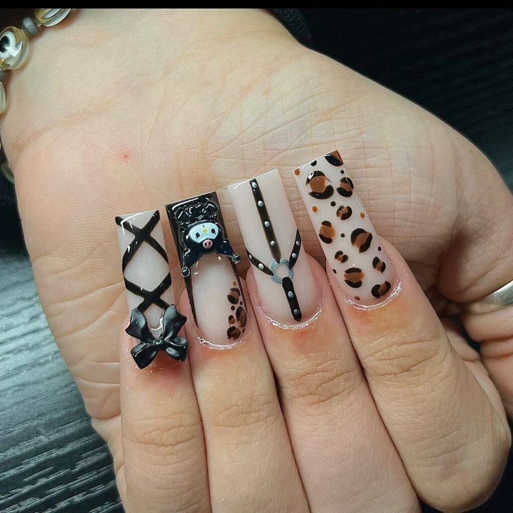 Unleash your inner wild side with these wicked nails, which seamlessly combine bold cheetah designs with corset-inspired freestyle charm, creating a captivating narrative that speaks volumes of unbridled confidence and the urge to kill all day.