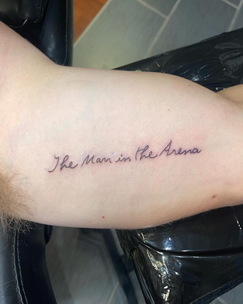 This tattoo features the phrase “Man in the Arena” written in elegant cursive. This is a reference to Theodore Roosevelt’s famous speech celebrating those who step into the ring and dare to face challenges head-on, regardless of success or failure.