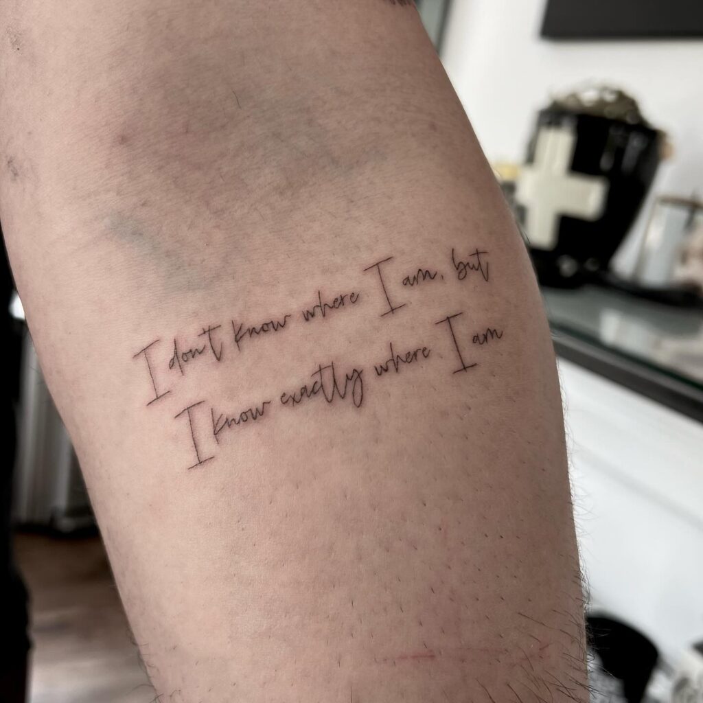This tattoo features a contemplative quote written in a soft, flowing font, combining vulnerability with self-awareness. This phrase expresses a paradox: although a person may feel lost in the larger sense of life, he still has a deep understanding of his current state. It is a reminder to embrace uncertainty and trust the process of self-discovery.