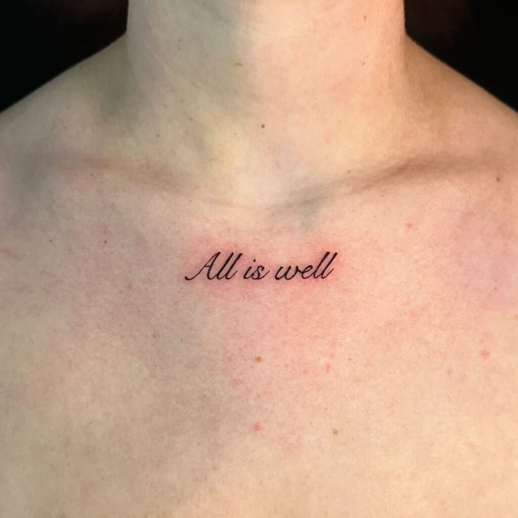 This tattoo features the comforting phrase “Everything is okay” written in elegant cursive on the upper chest area. The simple yet profound message serves as a reminder to trust the present moment and provides confidence in difficult times.