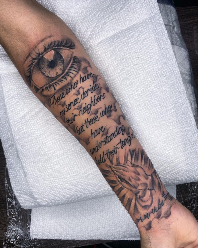This intricate tattoo features a detailed eye at the top followed by the verse from Proverbs 11:12: “Fools mock their neighbors, but those who understand hold their tongues.” There are also praying hands at the bottom of the design, symbolizing faith and humility.