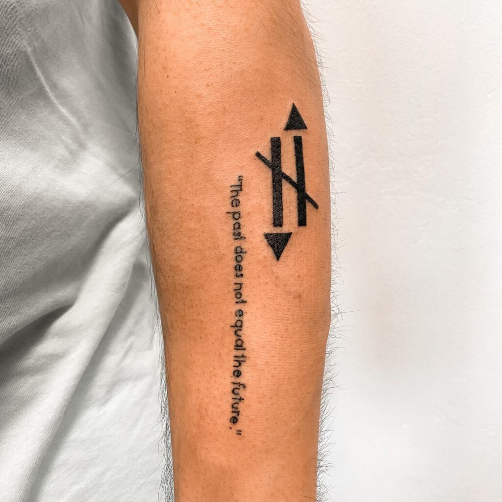 This tattoo features a bold geometric design combined with the phrase, “The past does not equal the future.” The combination of arrows and lines symbolizes direction and progress, reinforcing the idea that past experiences do not determine one’s future potential.
