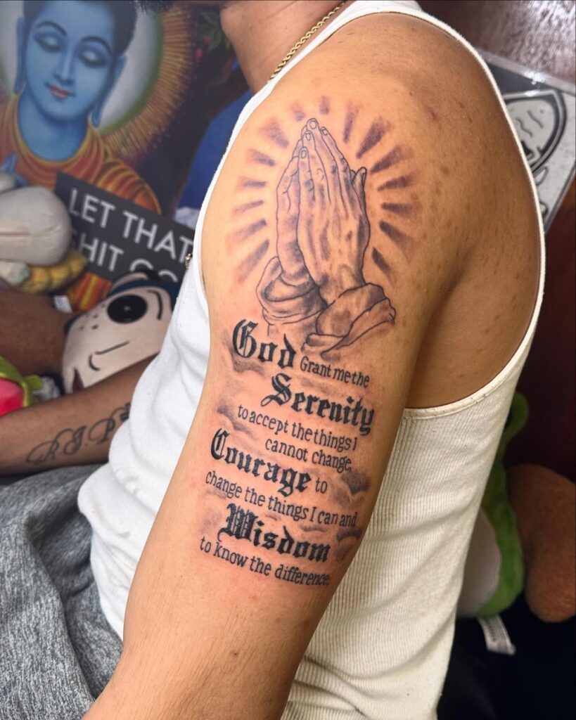 This tattoo features the iconic “Serenity Prayer” beautifully written on the shoulder, along with a pair of praying hands with glowing rays. The prayer asks for the serenity to accept what cannot be changed, the courage to change what can be changed, and the wisdom to know the difference.