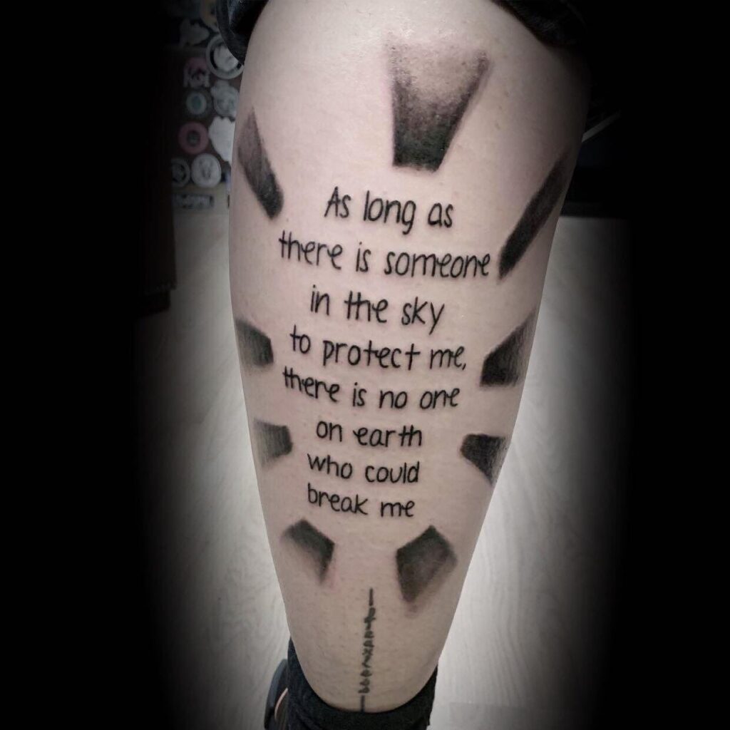 This tattoo carries an empowering message: “As long as there is someone in heaven to protect me, there is no one on earth who can break me.” The design features bold black accents around the text, creating a striking visual effect that highlights the protective power of faith. The message speaks of faith in divine protection, giving a sense of invincibility and spiritual stability.