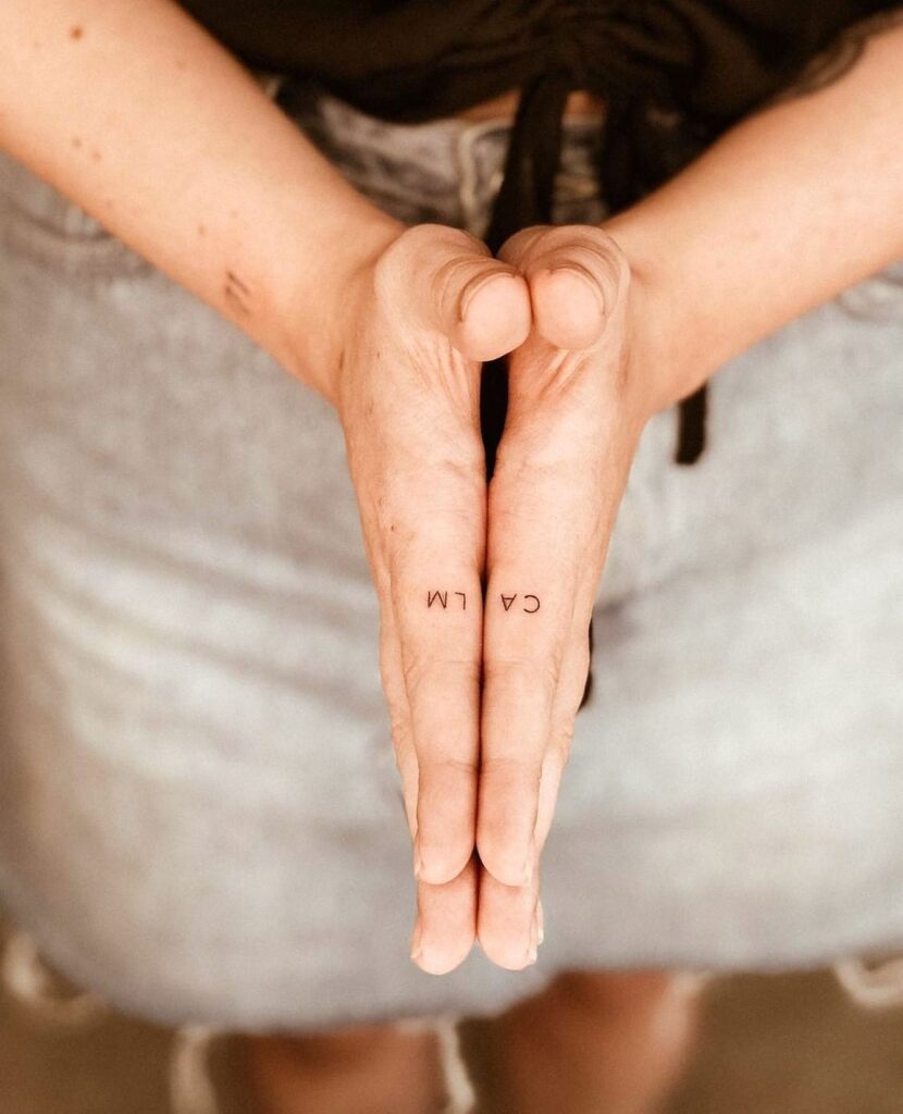 This minimalist tattoo features the word “Tranquility” split on the sides of both fingers, creating a subtle and meaningful design. When the hands are brought together, the word opens completely, symbolizing the importance of awareness and inner peace.