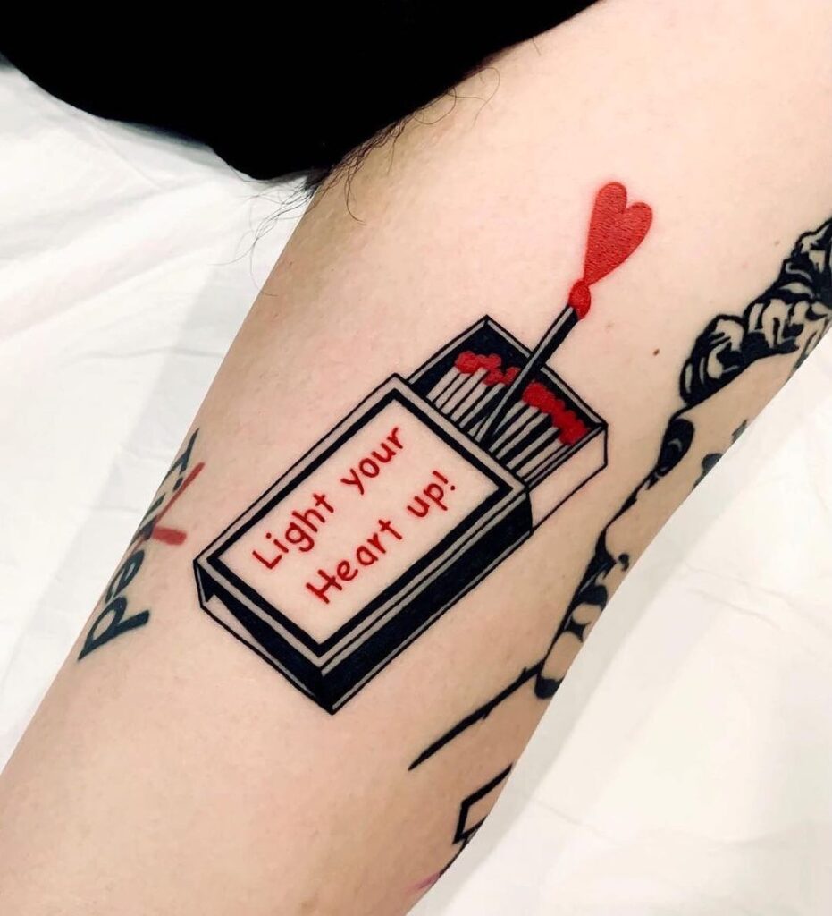 This vibrant tattoo features a box of matches with one lit match in the shape of a red heart. The phrase “Light up your heart!” appears on the matchbox in bold font, adding a motivating touch to the design. The playful combination of red accents and heart-shaped flames symbolizes the importance of igniting your inner fire and pursuing your passions.