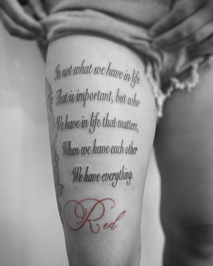 This beautiful tattoo features a heartfelt quote: “It’s not what we have in life, but who we have in life that matters. When we have each other, we have everything.” The elegant font paired with the personalized “Red” title in vibrant red ink at the bottom gives the design a personal touch.