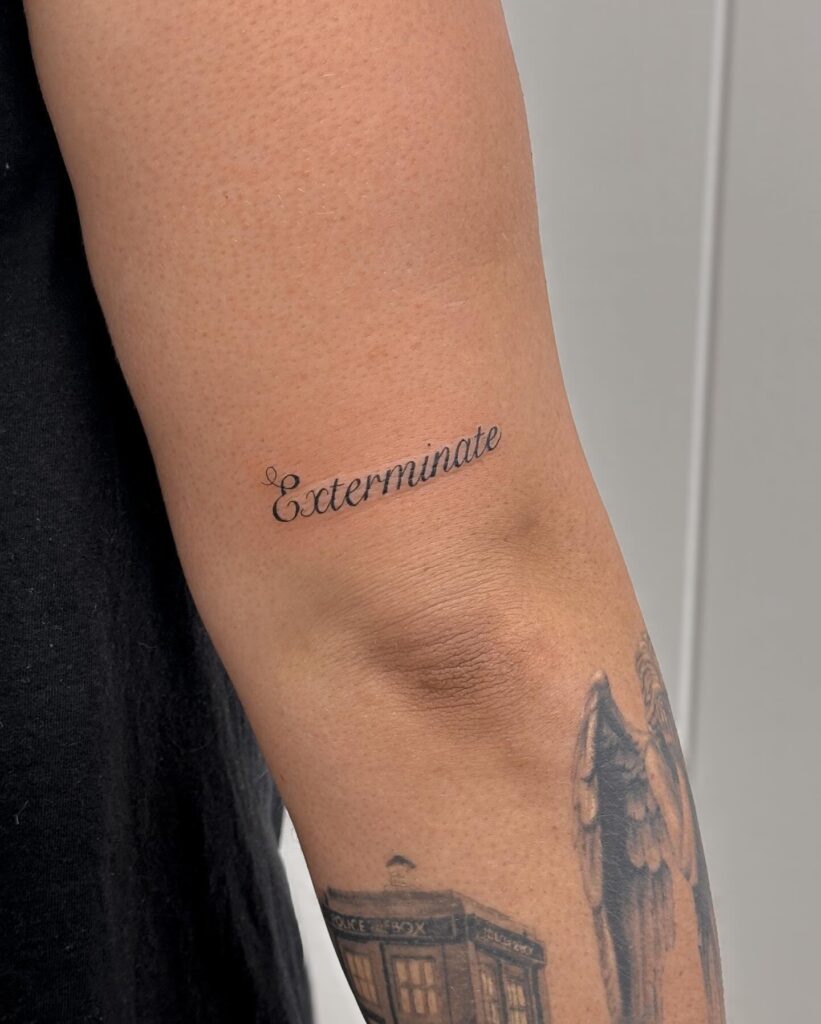The tattoo features the word “Exterminate” in clean cursive. The word is famously associated with the Daleks from Doctor Who, known for their robotic and emotionless nature. The choice of just this word creates a striking contrast between the elegance of the handwritten font and the harshness of the term itself.