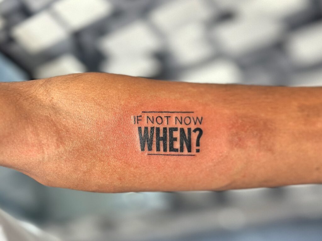 This tattoo depicts the powerful phrase “If not now, then when?” in bold bold font. The emphasis is on the word “WHEN?” emphasizes a sense of urgency, encouraging the wearer to seize opportunities and act without hesitation.