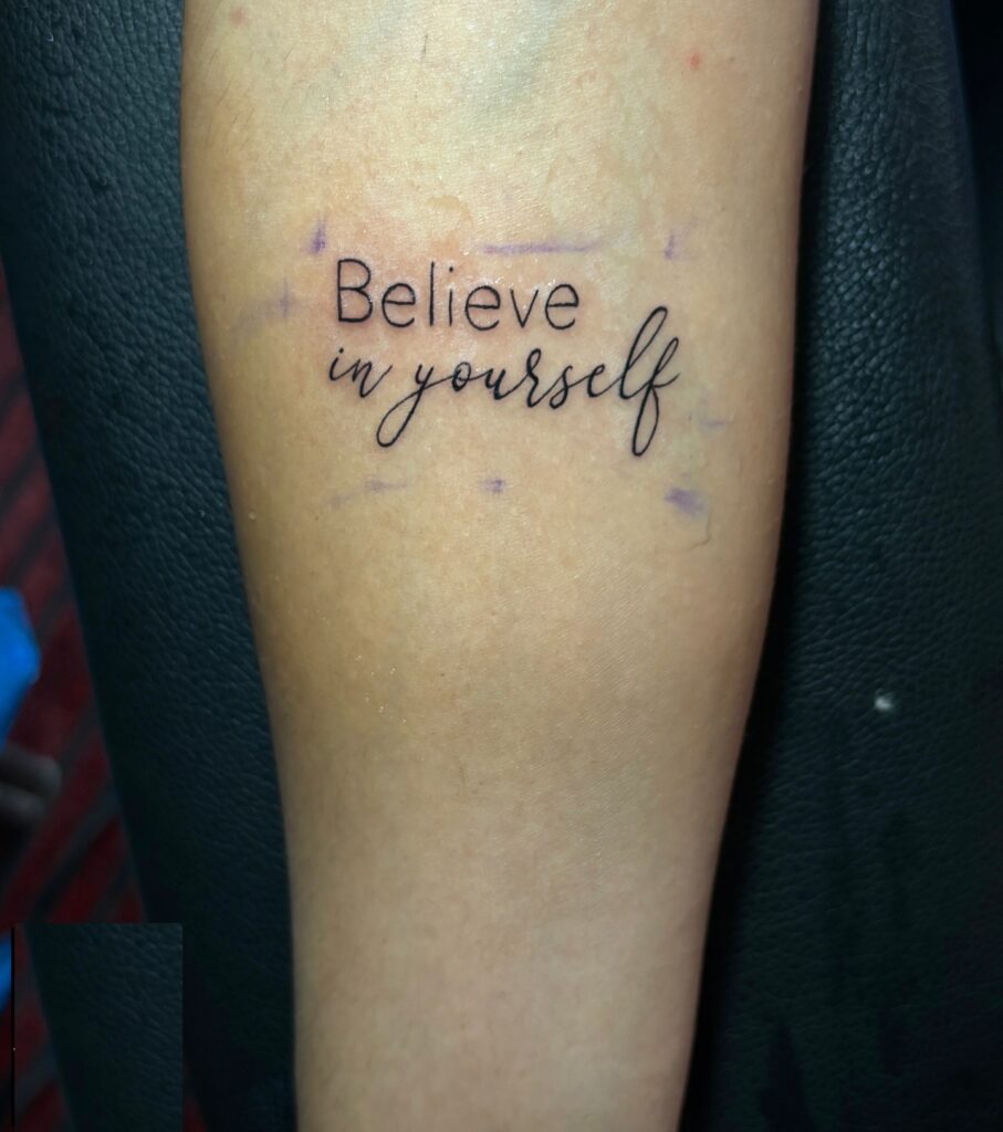 This tattoo features the empowering phrase “Believe in Yourself” written in a clean, elegant script font. The contrast between the two styles highlights the balance between clarity and personal expression.