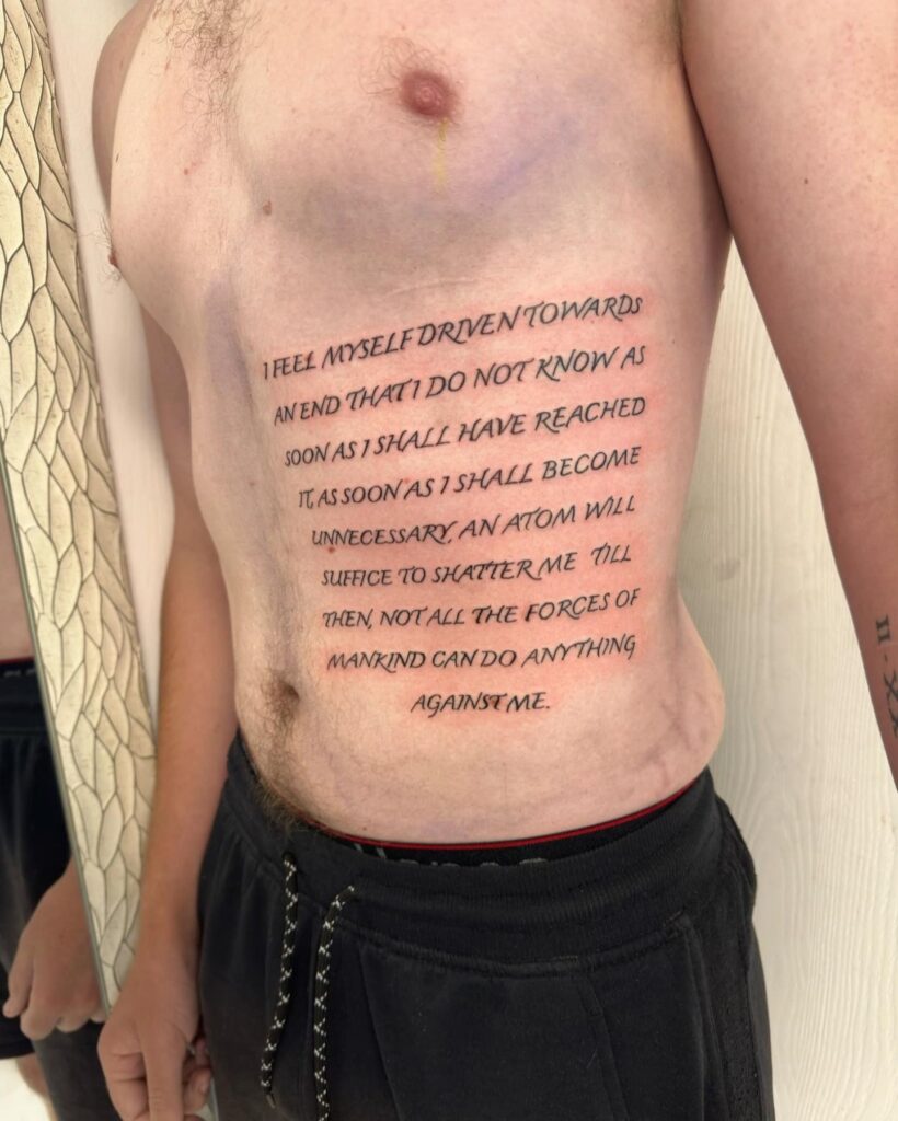 This large tattoo on the side of the torso contains a deeply philosophical passage about the feeling of longing for an unknown end, where one becomes unnecessary and fragile, but indestructible until that moment comes. The quote reflects a sense of determination and inevitability, suggesting that nothing can harm the owner until his goal is achieved.