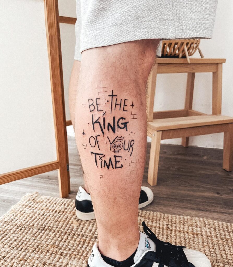 This playful tattoo features the bold hand-drawn phrase “Be the King of Your Time” with a small crowned skull included in the design. The whimsical graffiti-style lettering and accompanying illustrations give the book a creative, rebellious feel.
