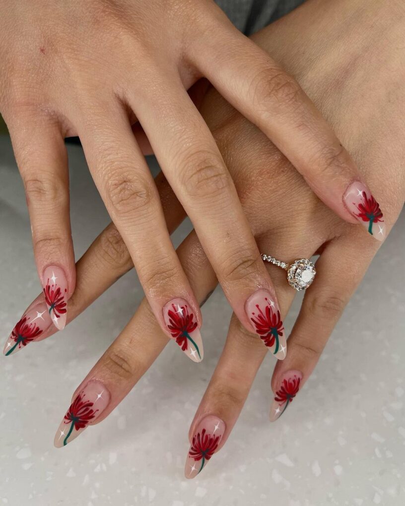 Add a touch of romantic drama with red Bleeding Heart nail art, a striking choice that will infuse your look with passion and elegance and is an enchanting option for Halloween, effortlessly combining bold style with mesmerizing charm.