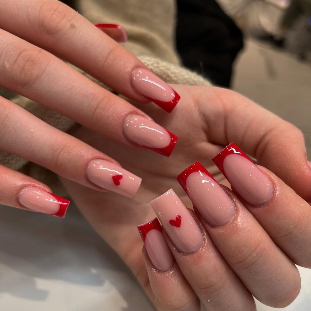 Modernize the timeless elegance of the French tip with a bold twist, adding a pop of red and a hearty accent, transforming your nails into a romantic masterpiece and creating a bold and beautiful look that speaks volumes.