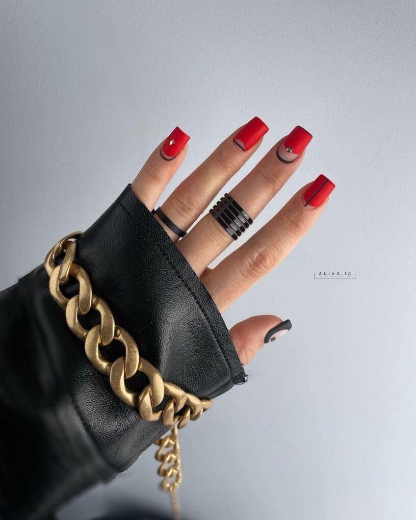 Immerse yourself in a seductively luxurious red and gold combination that blends the timeless sophistication of red with the luxurious shimmer of gold to create a bold and beautiful manicure that exudes elegance and glamor.