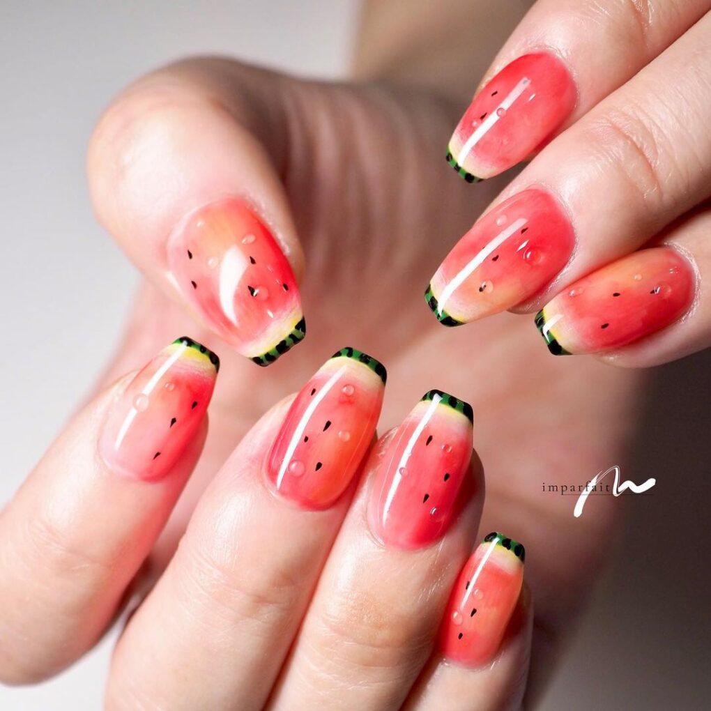 Refresh your bold and beautiful aesthetic with the vibrant charm of Watermelon Nails, where rich red hues and contrasting green accents combine in a playful and summery design, adding a delightful twist to your manicure.