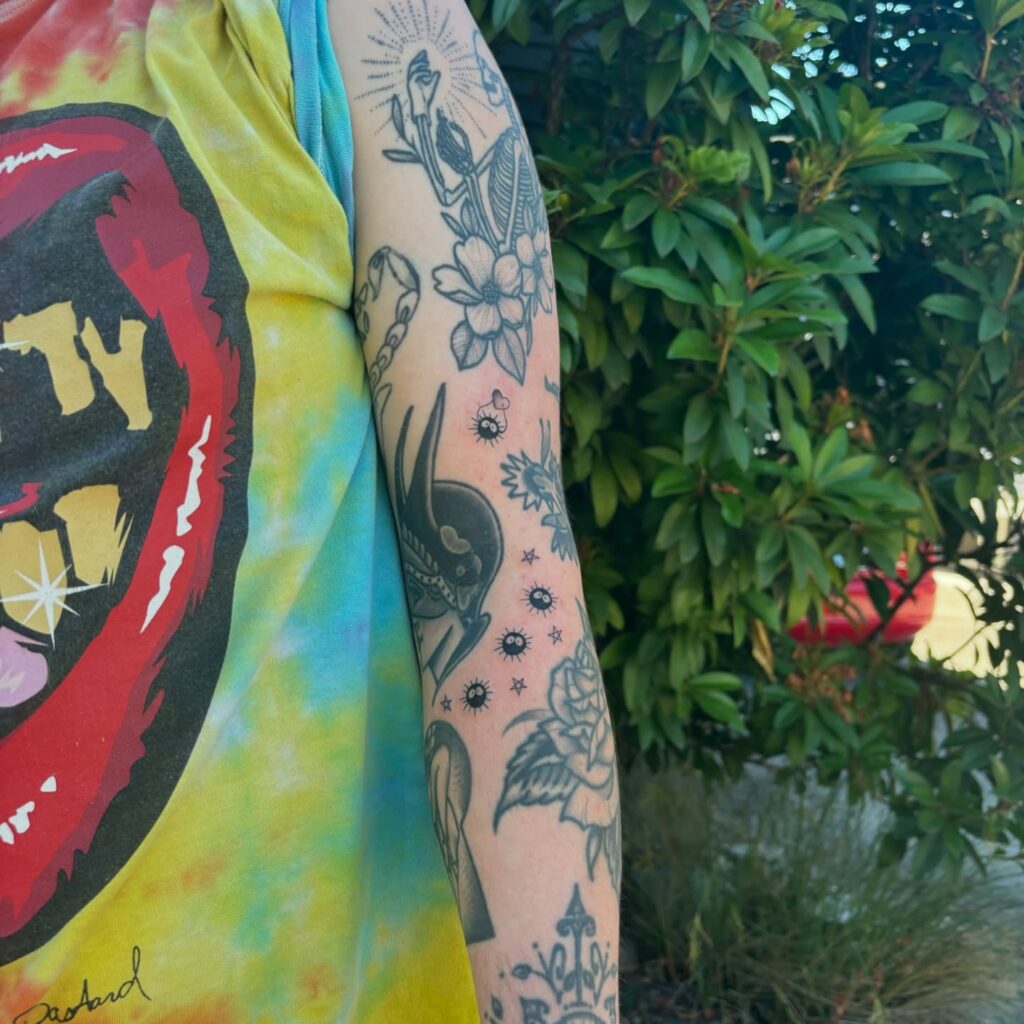 Their tiny eyes and floating candy stars contrast well with the bright and dark tattoos around them. These fillers are perfect for those looking to add some personality to their sleeve while adding a touch of personality and a subtle nod to their favorite cartoon classic.