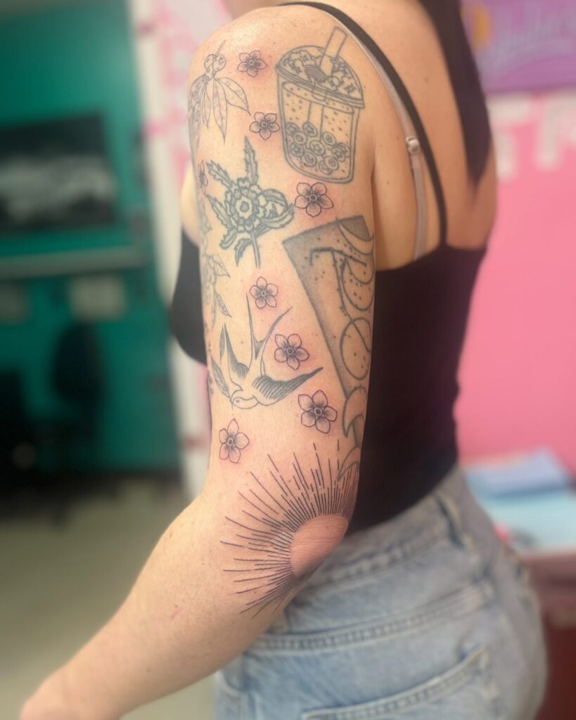 This playful sleeve filler uses scattered cherry blossoms and sparkling sunbursts to bring a collection of whimsical tattoos together. Soft pink flowers fill the empty spaces between fun elements like boba tea, pizza and birds, tying everything together with an easy, cohesive vibe.