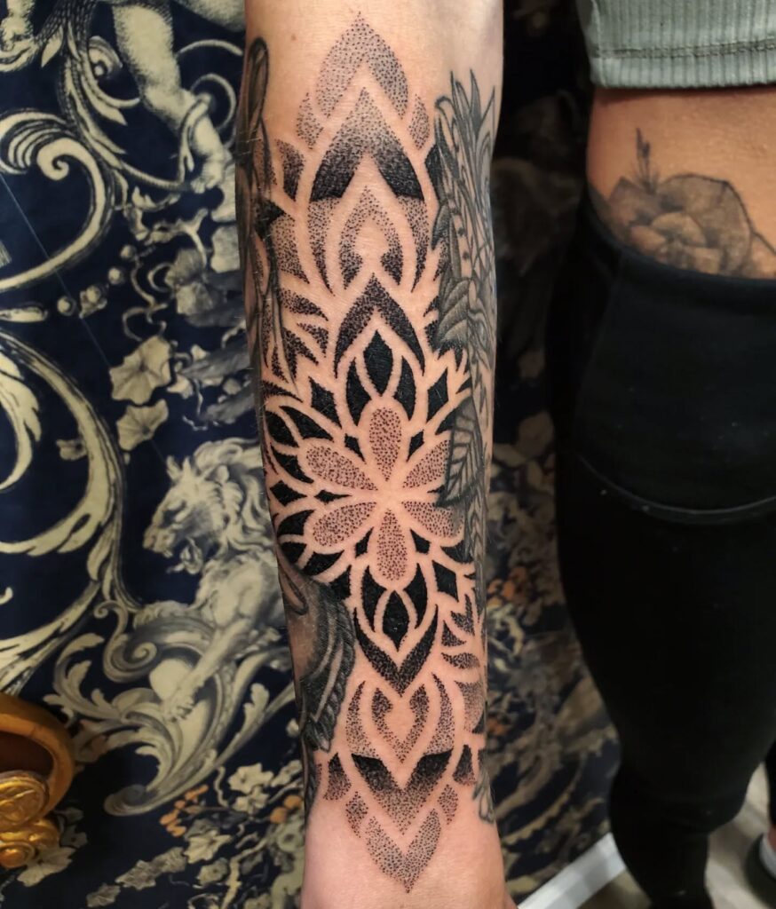 This striking mandala-inspired piece uses bold black embroidery techniques and dotwork to create a detailed floral design that flows smoothly across the forearm. The design features layered geometric petals and pointed arches, creating an almost stained glass effect.