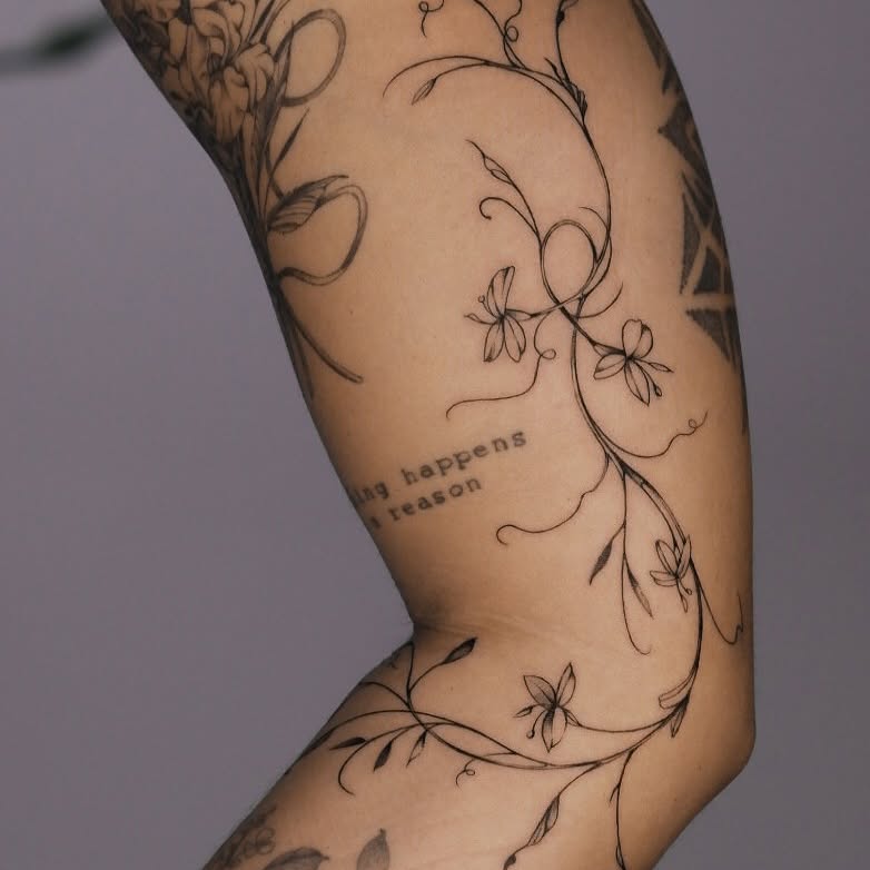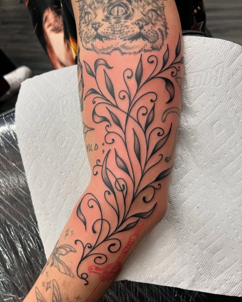 This elegant sleeve filler features delicate, flowing vines with dainty flowers that gently wrap around the arm. Fine lines give the tattoo a light and graceful look, perfectly complementing existing tattoos without overwhelming them.