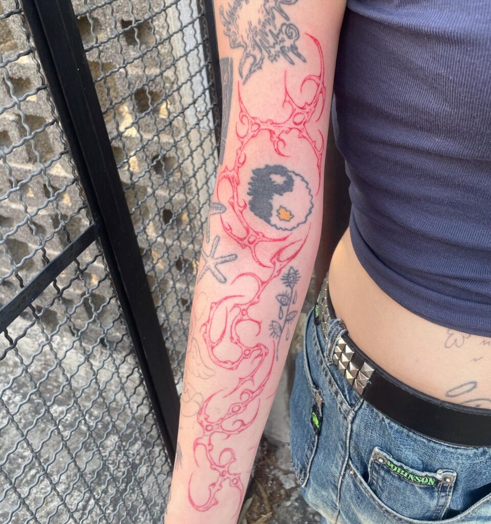 This unique sleeve filler uses vibrant red ink to create an abstract spiky pattern that flows down the forearm. Its organic, flame-like lines wrap around existing tattoos, including a fuzzy yin-yang symbol and a star, adding movement and striking contrast in both color and texture.