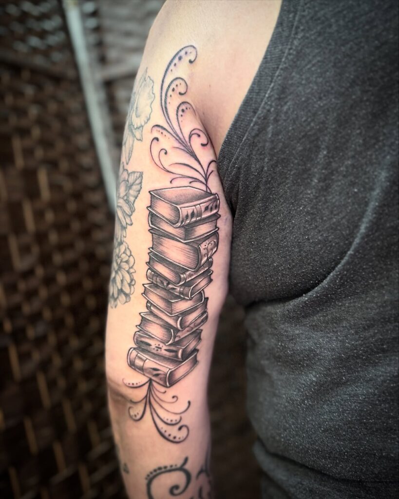 Decorative swirls extend from both ends of the stack, adding a flow and elegance that helps it blend seamlessly with surrounding tattoos. This design is ideal for filling vertical spaces on the arm and not only pays tribute to a passion for reading, but also adds structure and balance to a personal tattoo collection.