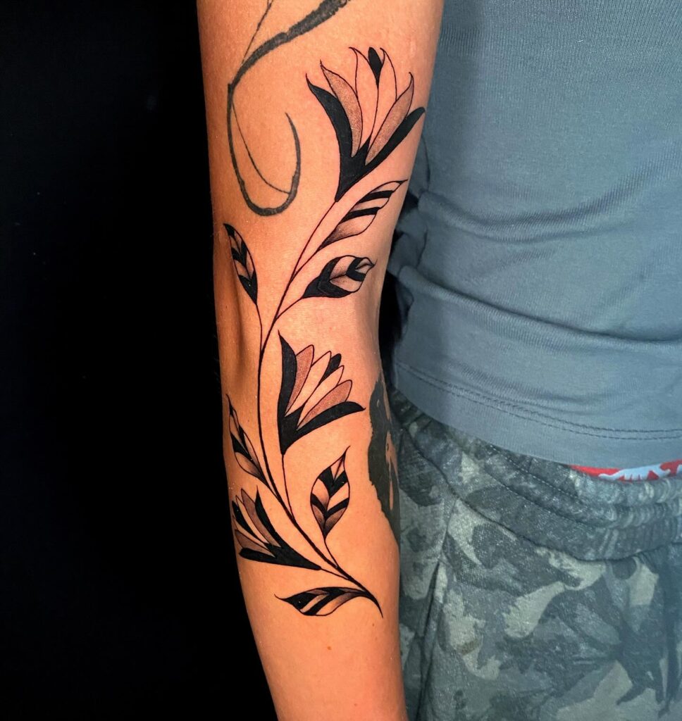 This statement sleeve filler features a vibrant black floral vine that curves elegantly along the forearm. Sharp, stylized leaves and petals alternate between solid black and negative space, creating a powerful contrast that catches the eye.