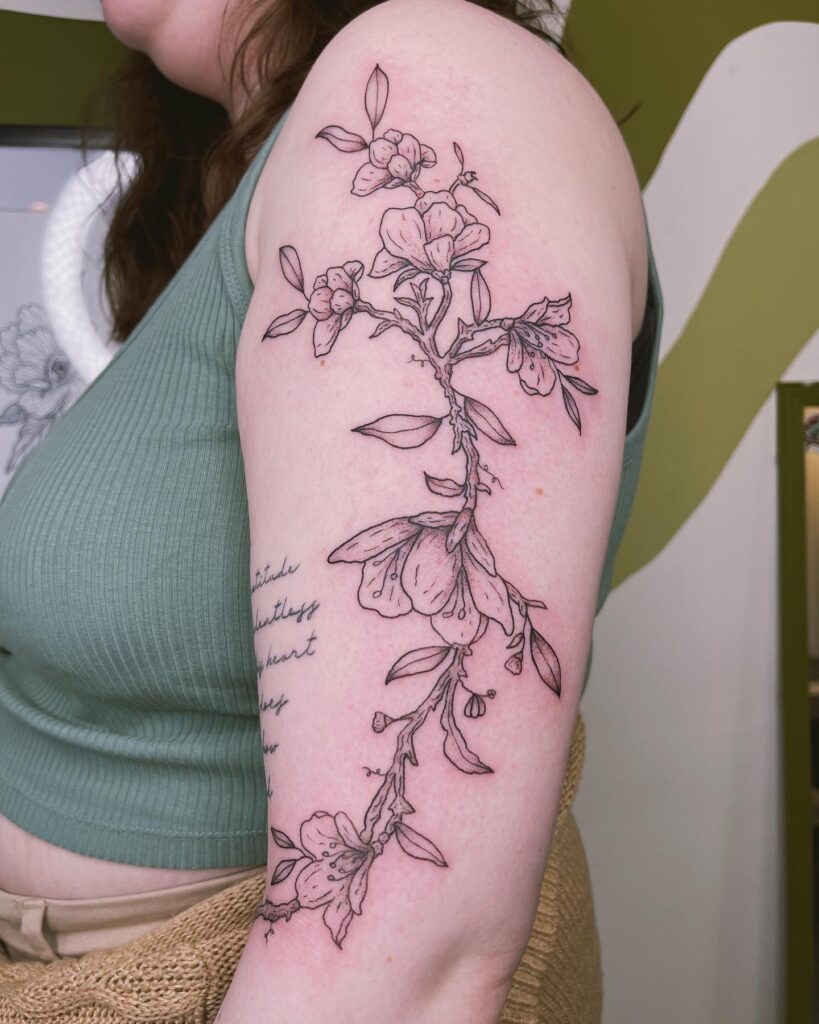 The graceful sleeve filler features a sinuous dogwood branch that flows elegantly down the shoulder. Rendered with soft, fine lines, each flower and bud is carefully detailed to capture the dogwood flower’s signature four-petal shape.