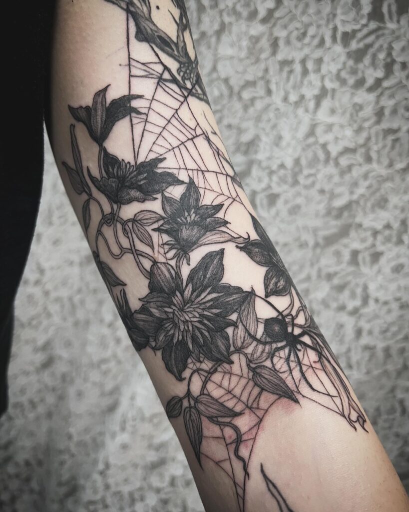 This gothic style sleeve filler features rich black flowers intertwined with twisting vines and delicate cobwebs, creating a charming dark garden effect. The floral details are bold yet subtle, with deep hues that add drama and texture.