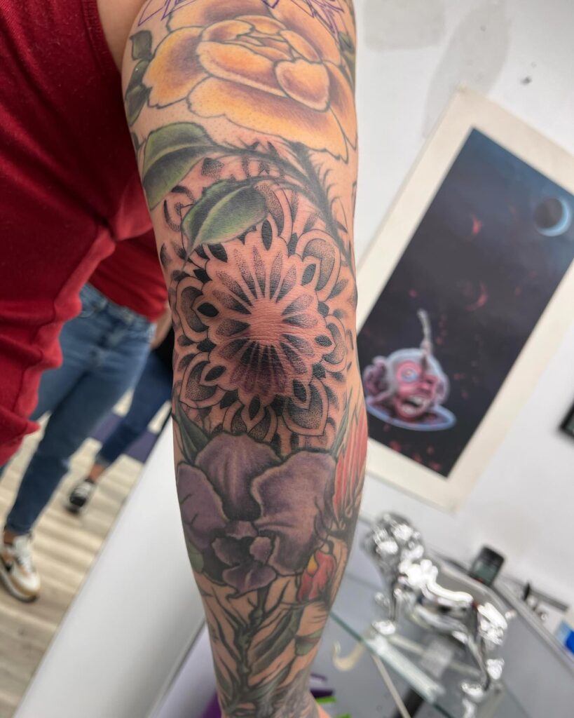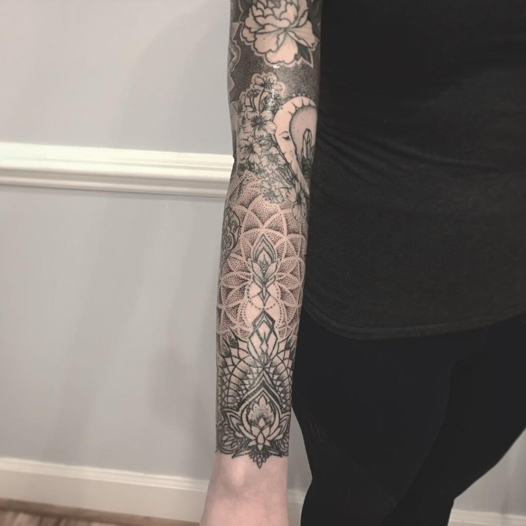 This stunning dotted sleeve filler blends sacred geometry and floral motifs seamlessly to create a harmonious flow along the forearm. Featuring layered mandala petals and ending with an intricate lotus at the wrist, the design is rich in symmetry and spiritual symbolism.