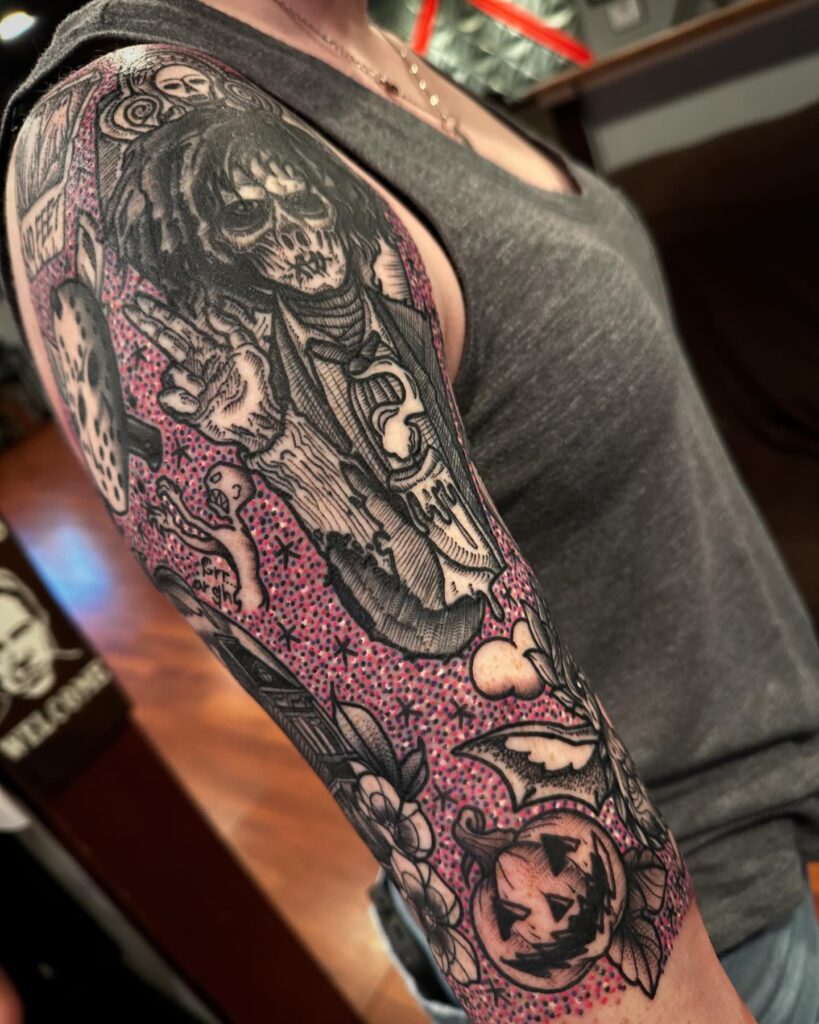 This sleeve filler uses a vibrant mix of pink and purple dots to bring together a collection of spooky Halloween themed tattoos. The textured background highlights detailed black designs like the jack-o’-lantern, bat, and ghoulish figure without overwhelming them.