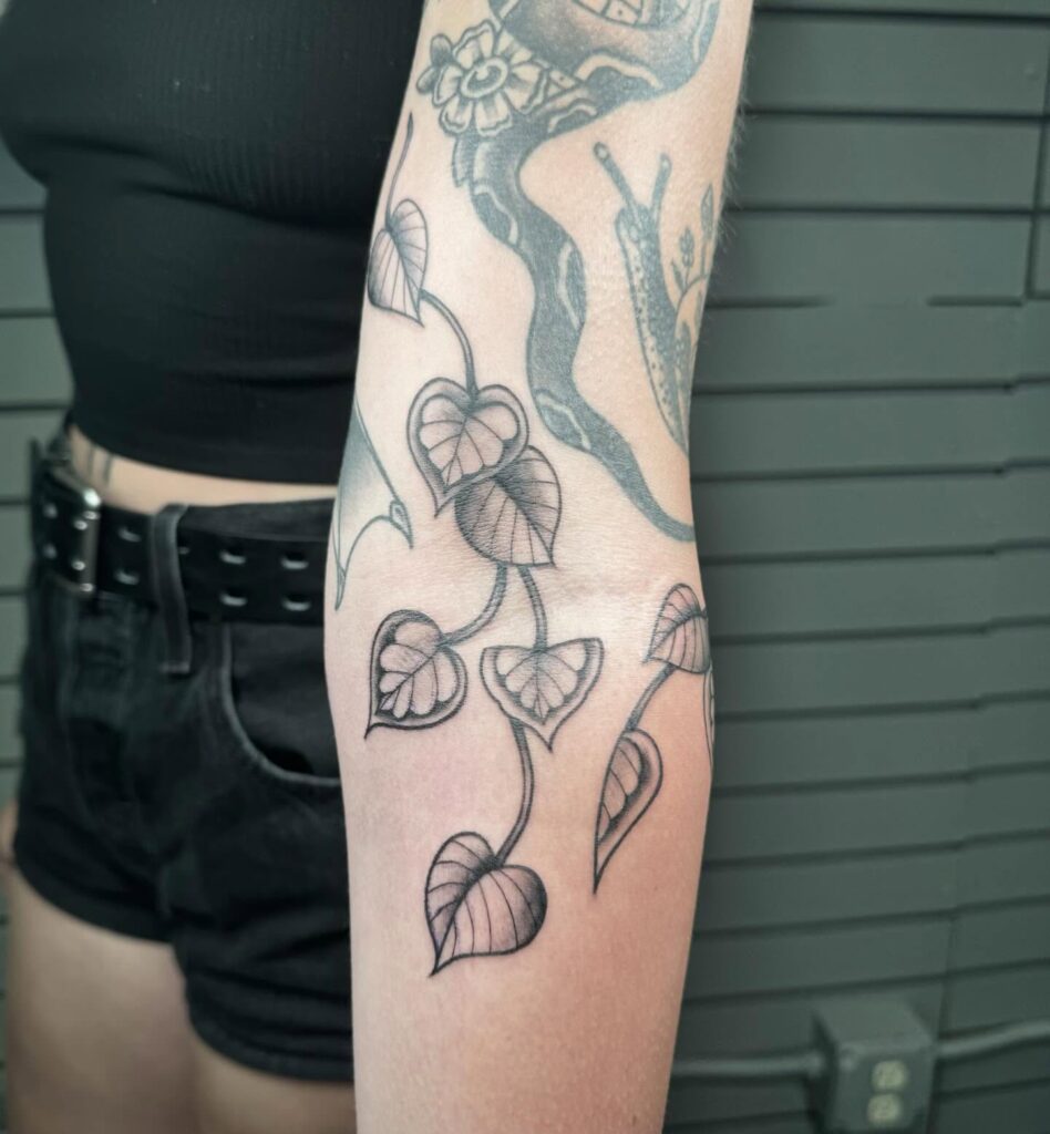 This adorable sleeve filler features a delicate pothos vine that naturally climbs up the arm. The heart-shaped leaves are softly shaded, creating a subtle three-dimensional effect, while the trailing stems intertwine seamlessly with existing tattoos.