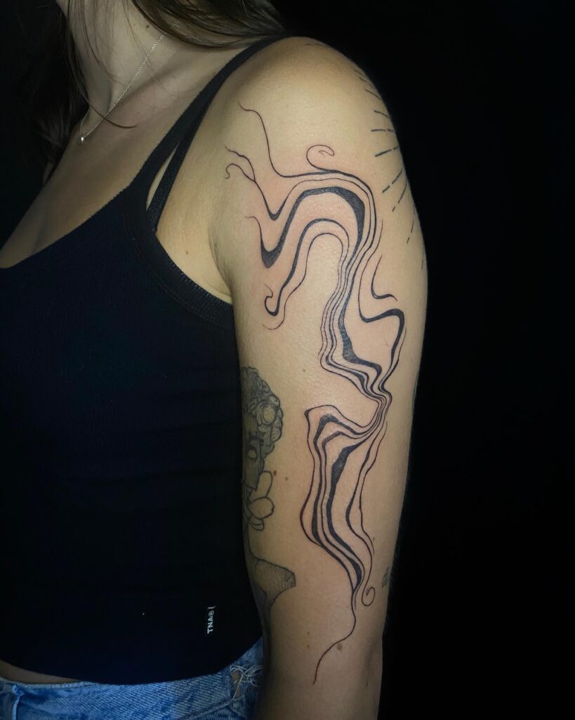In this abstract sleeve filler, flowing wavy lines create a mesmerizing visual rhythm on the shoulder. The design features both bold and subtle strokes that swirl and wavy, adding dynamic movement and contrast to the surrounding tattoos.