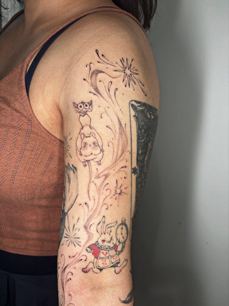 This adorable sleeve filler features delicate, swirling lines and soft sparkles that create a magical, whimsical flow around existing tattoos. The airy design gracefully brings together playful characters such as Totoro and the White Rabbit, enhancing their fairy-tale charm.