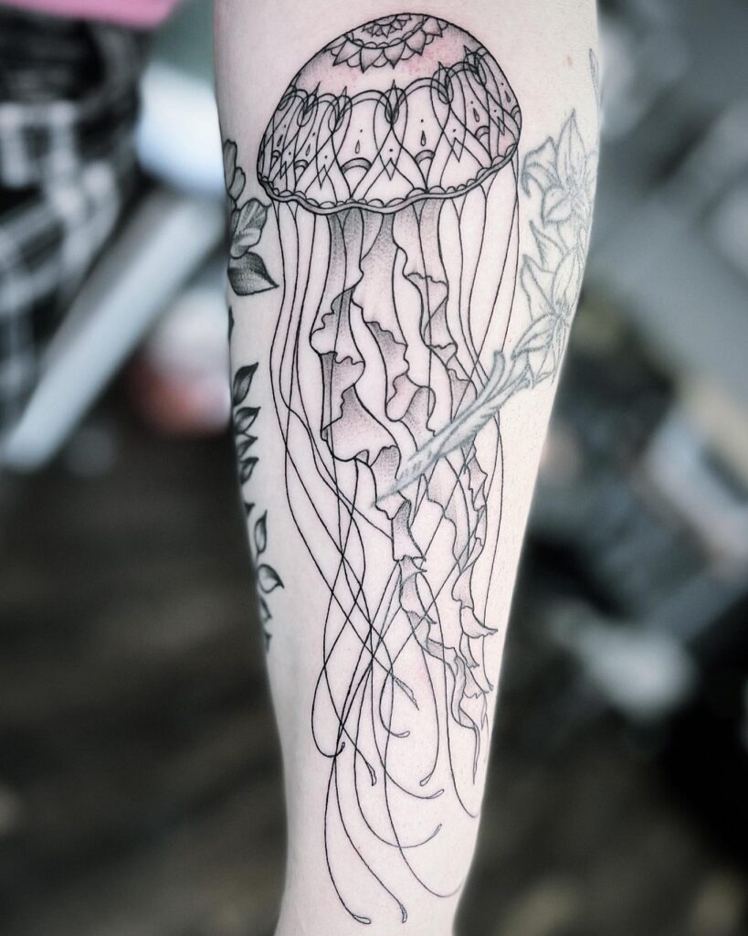 This elegant jellyfish tattoo serves as a statement sleeve filler, combining nautical beauty with a flowing, ornamental style. The top of the jellyfish is decorated with intricate patterns reminiscent of a mandala, and the tentacles flow down in soft, flowing lines that naturally move according to the shape of the hand.