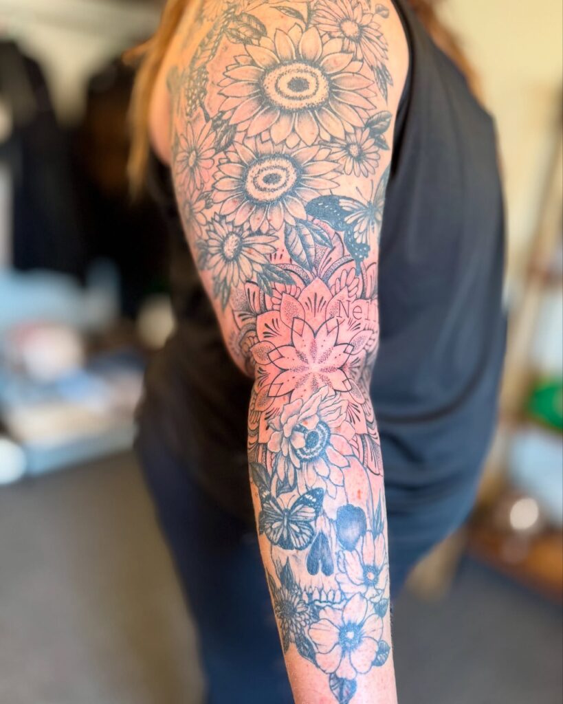 This sleeve filler combines detailed floral patterns with soft touches to create depth and movement throughout the arm. Flowers, including sunflowers and daisies, are beautifully arranged with smooth spaces between them, giving the piece an airy, natural feel.
