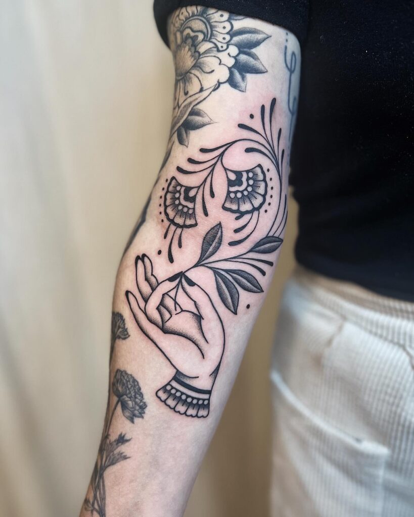 This adorable sleeve filler features a delicately stylized hand holding a leafy stem surrounded by decorative floral accents and dotted swirls. Bold black lines combine with soft touches to create a balanced, eye-catching design that flows naturally along the forearm.