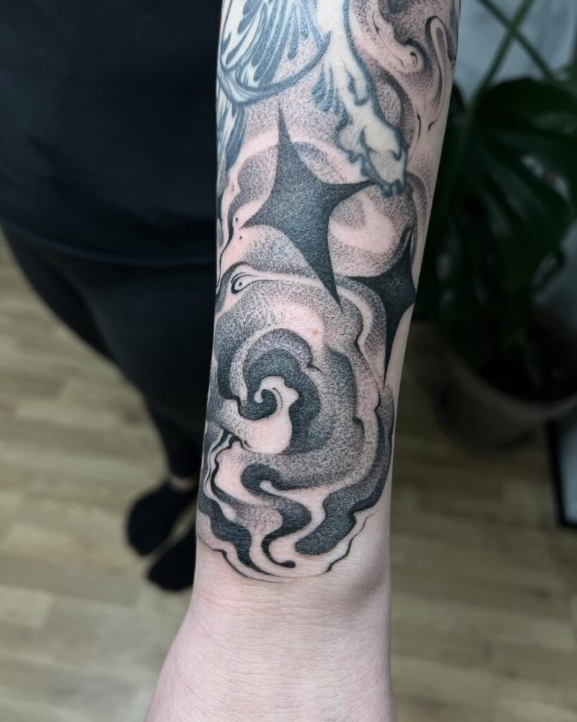 This bold and atmospheric sleeve filler features flowing smokey swirls and sharp black stars that add dramatic contrast and texture. Soft stippling and flowing curves create movement, while bold negative space shapes enhance depth and separation.