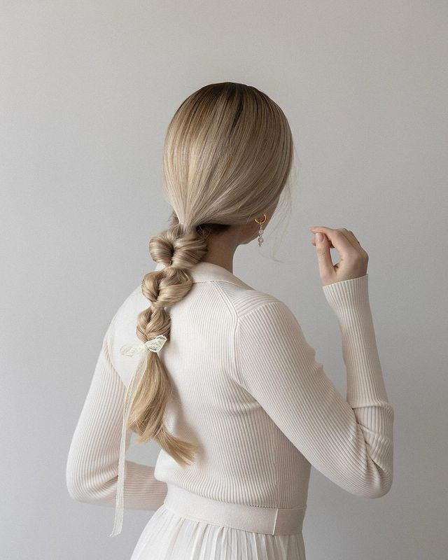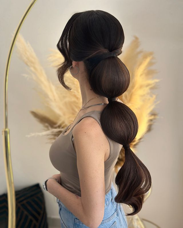 The high bubble ponytail exudes playful sophistication while offering a whimsical twist on the classic ponytail. With stacked bubbles adding volume and glamor, this hairstyle is not just for the pros but for you too. Ideal for everyday walks and special events. It will highlight effortless elegance and inspire you to try something new and exciting.