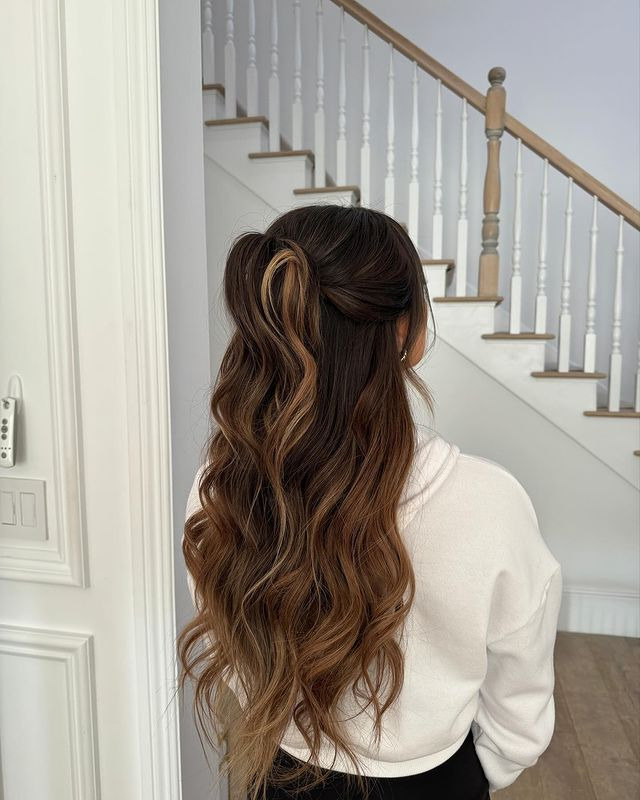 Combine the best of both worlds with a chic half-up, half-down ponytail. This versatile hairstyle strikes the perfect balance between sophistication and ease, making it perfect for both everyday outings and special occasions.